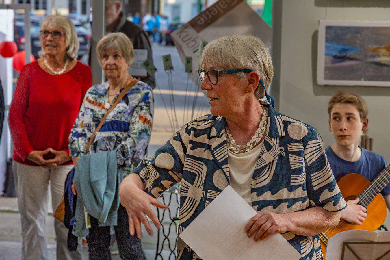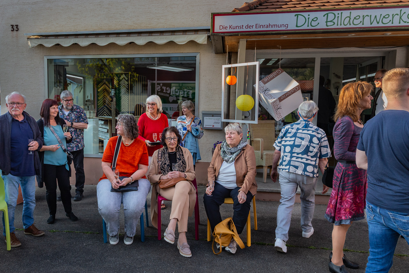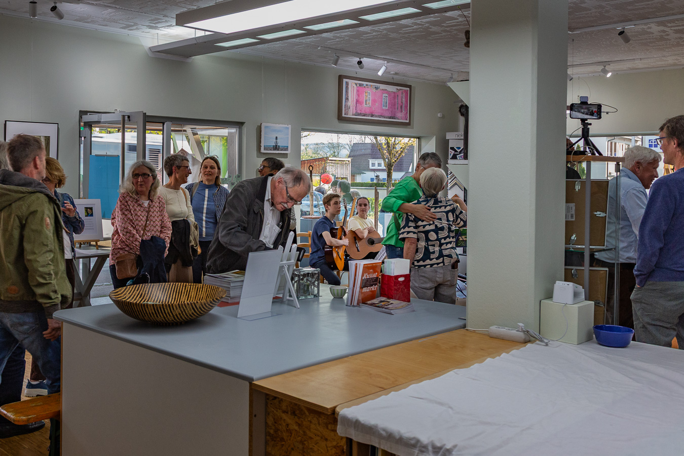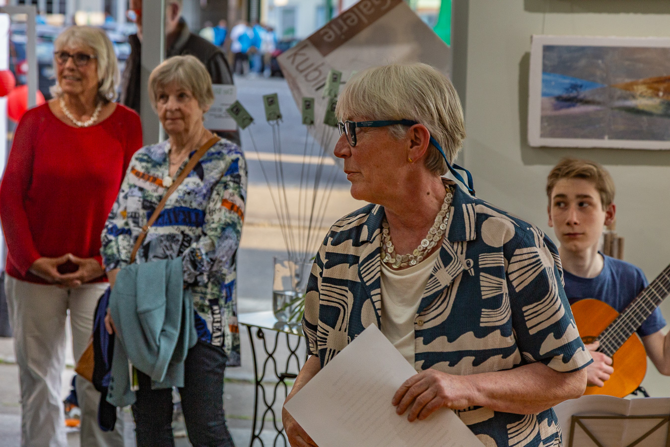 Musikalisch begleiteten Frederik Steinbrecher, Sarah Joos und Ben Speidel an den Gitarren und Pauline Ordowski, Gesang, von der Jugendmusikschule Steinlach e. V. den Abend. Bei einem kleinen Imbiss nahmen die rund 60 Gäste die Gelegenheit wahr, mit den Kunstschaffenden ins Gespräch zu kommen und sich über deren Arbeiten auszutauschen.